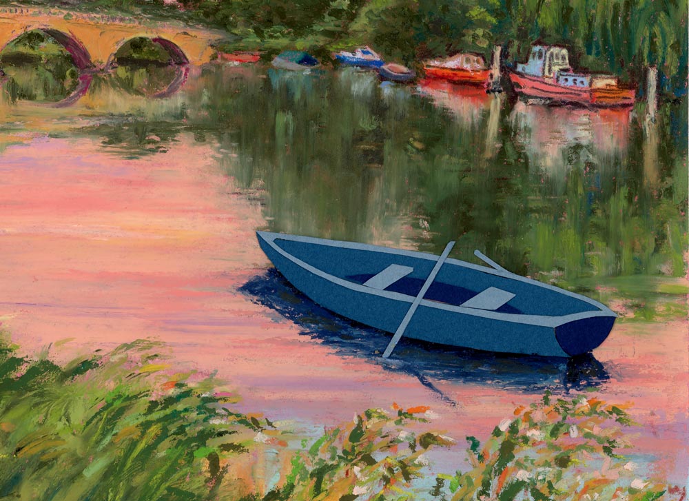 As the sun sets, the empty boat drifts quietly on the river, like a wandering soul searching for its way home.