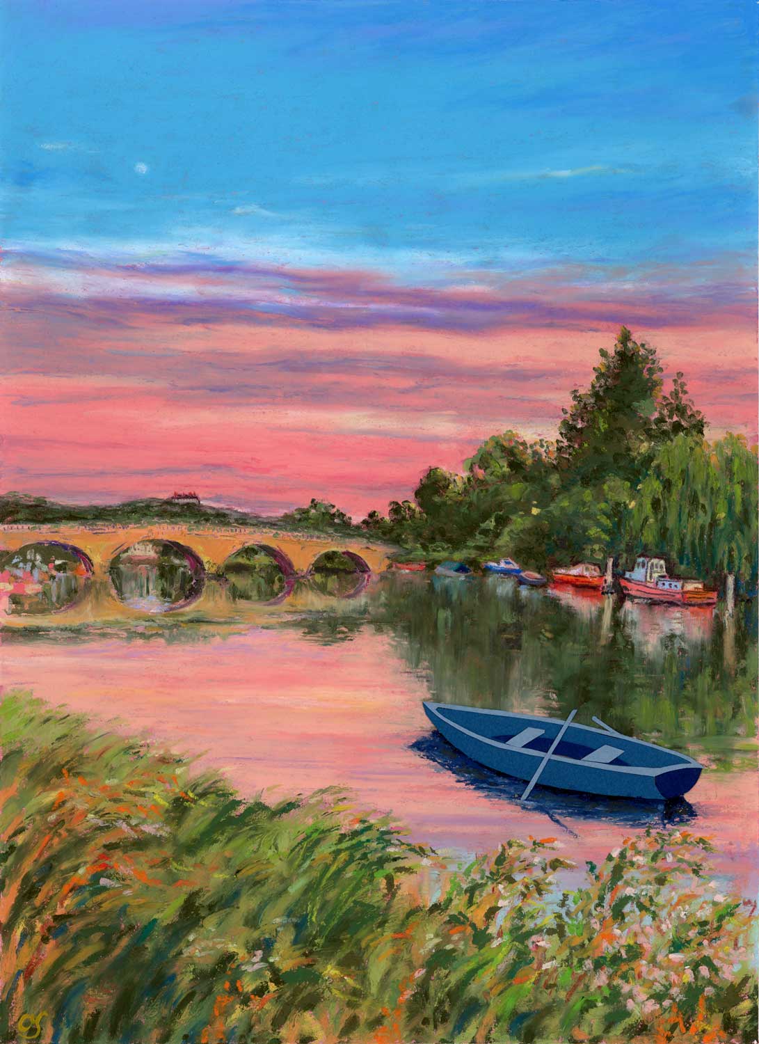 As the sun sets, the empty boat drifts quietly on the river, like a wandering soul searching for its way home.
